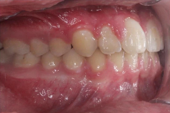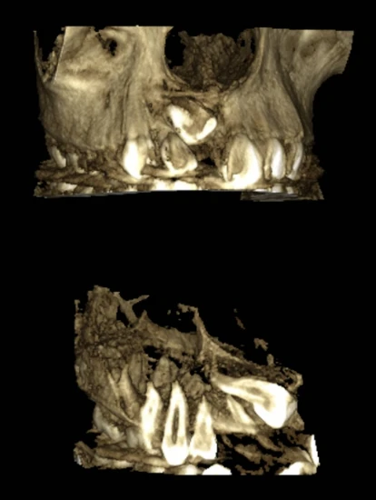בבדיקה הקלינית והדימותית נמצא כי שן 11 הייתה כלואה בעמדה הוריזונטלית חריגה, מעל שורשי החותכת הלטרלית והניב, עם מורפולוגיית שורש אבנורמלית ועם הפרעה ממשית לבקיעה התקינה של שיניים 12 ו 13, שכבר הראו הטיה משמעותית. בגיל זה לא ניתן היה לשקול שתל כפתרון חלופי, אך גם השארת השן הכלואה במקומה לא הייתה אפשרית, משום שהיא חסמה את התפתחות ובקיעת השיניים הסמוכות ופגעה במבנה התקין של הקשת המתפתחת.