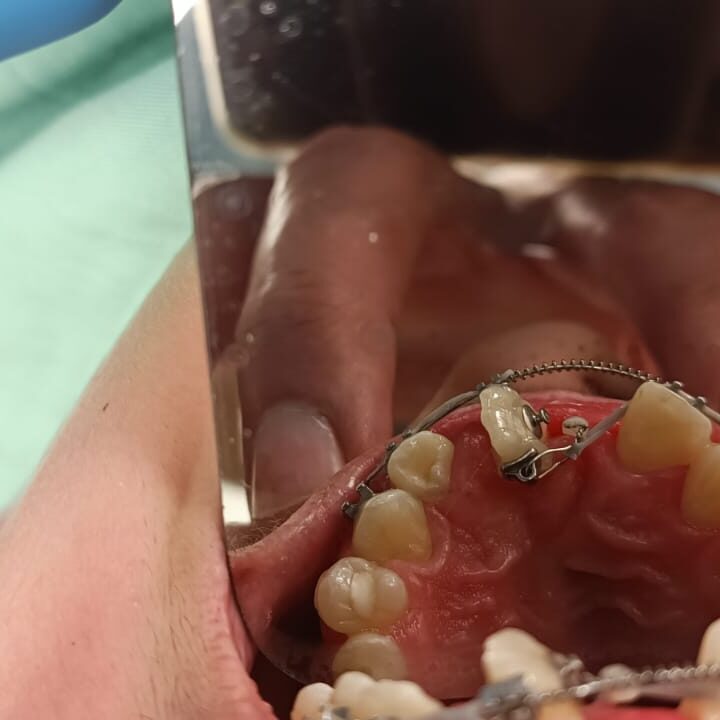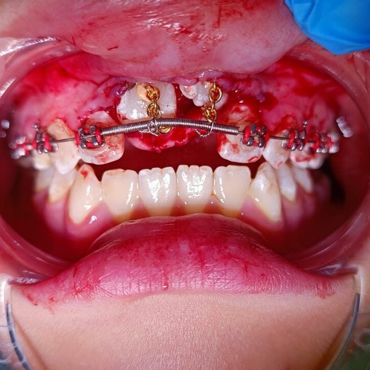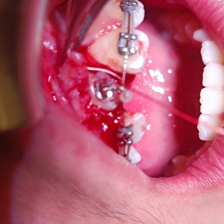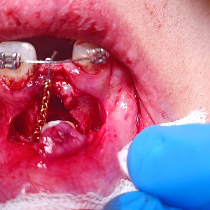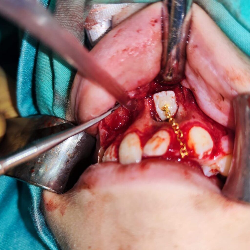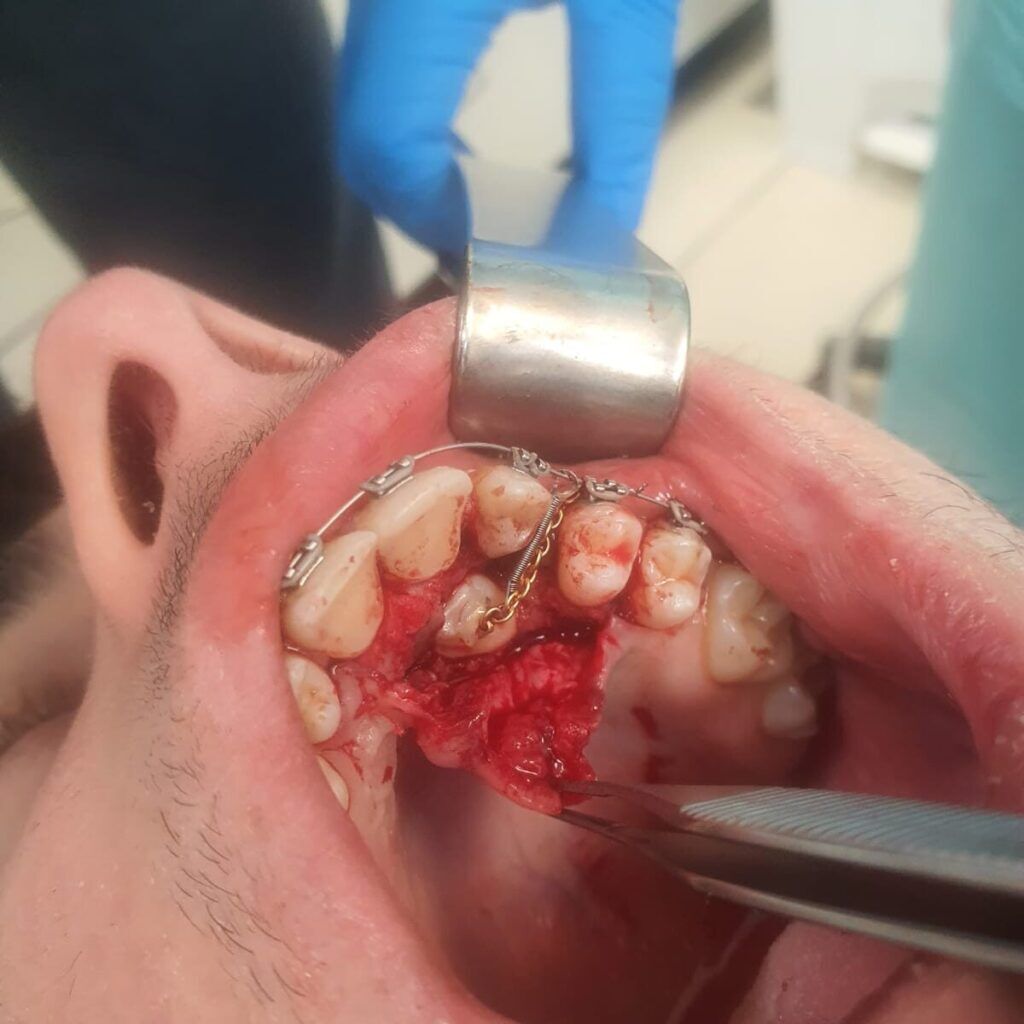 - חשיפה כירורגית זעירה – בהרדמה כללית, טשטוש או הרדמה מקומית, במרפאה או בחדר ניתוח, ע"י פריודונט או כירורג פה ולסת – תמיד בנוכחות ובליווי האורתודונט, ד"ר נועם פרוטר אשר בודק את השן החשופה ומדביק את כפתור הזהב על השן.